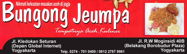 | Nikmati Kelezatan Masakan aceh di jogja Bungong Jeumpa Tempatnya Aceh Kuliner Jl. RW. Monginsidi 40B (Belakang Borobudur Plaza) Yogyakarta Jl. Kledokan Seturan (Depan Global Internet) Yogyakarta Telp. 0274 – 701 0400 / 0812 2787 9981 | |||||||||||||||||